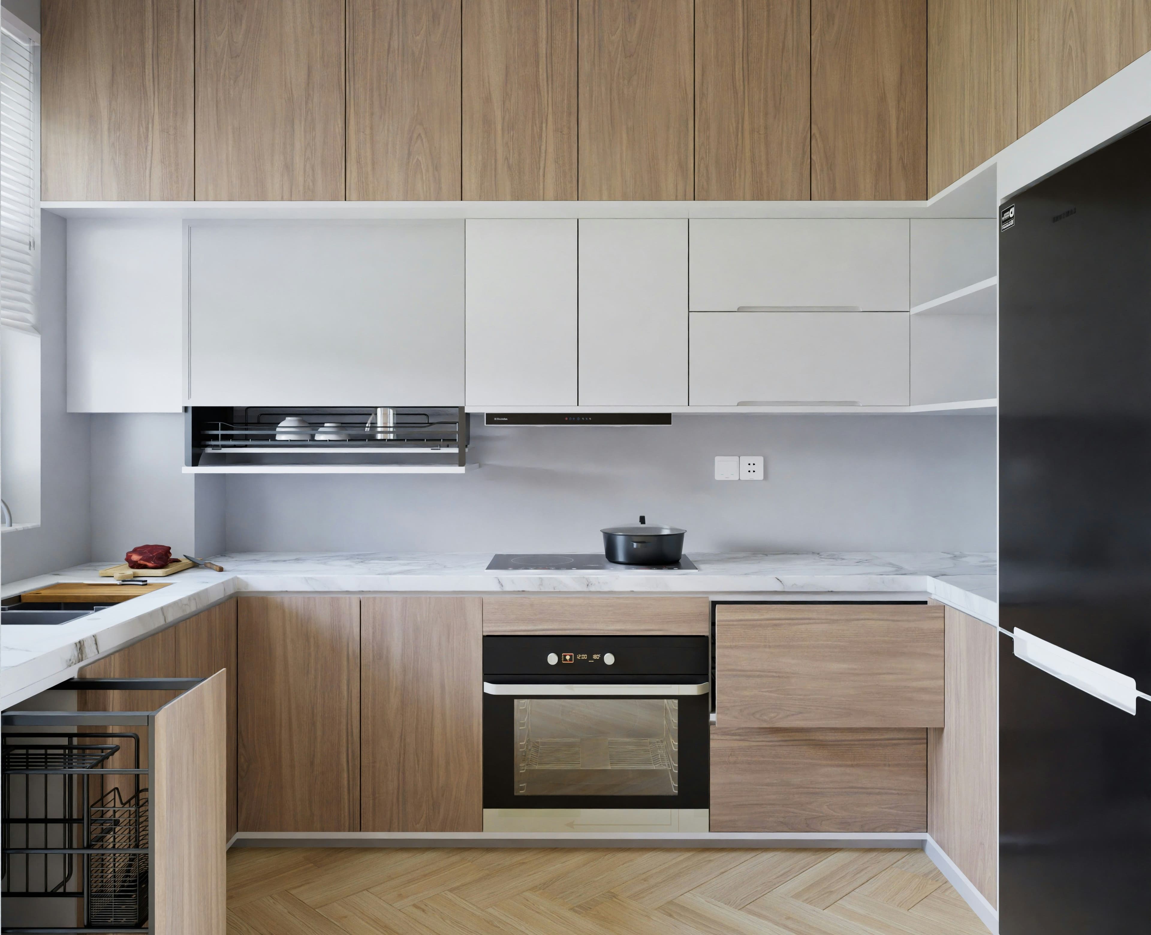 - Hidden Pull-Out Units: Pull-out pantries, retractable chimneys, and foldable shelves are space-saving game changers.